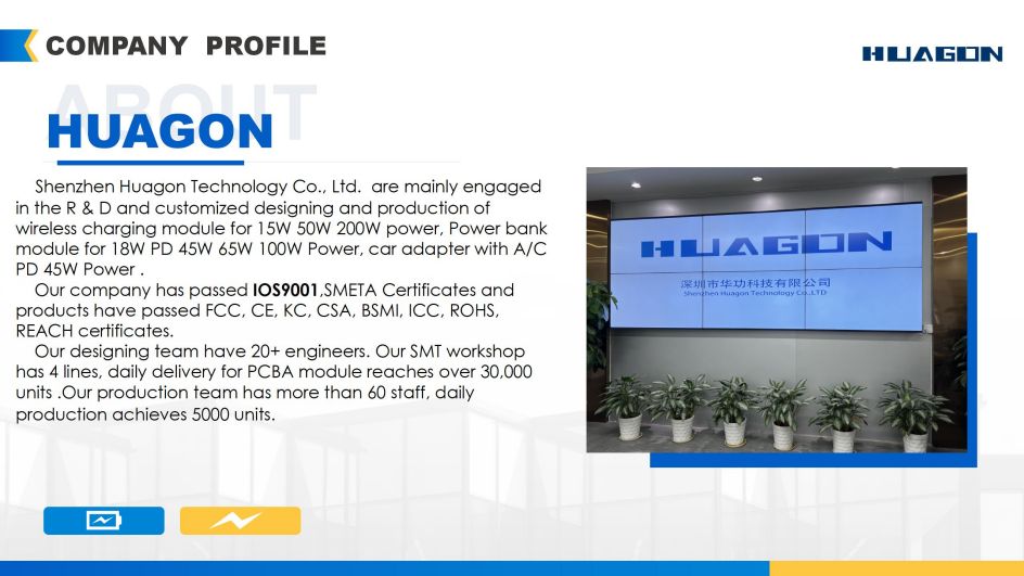 - Shenzhen Huagon Technology Co., Ltd. beschäftigt sich hauptsächlich mit der kundenspezifischen Anpassung, Entwicklung und Produktion von drahtlosen Lademodulen. Es gibt 15 W, 50 W, 200 W kabellose Lademodule, 18 W PD, 45 W, 65 W, 100 W mobile Stromversorgungsmodule und A/C PD 45 W kabellose Autoladegeräte. Unser Unternehmen hat die IOS9001-Zertifizierung des Qualitätssystems sowie die SMETA-Zertifizierung für Arbeit, Gesundheit, Sicherheit und Umwelt bestanden. Unsere Produkte haben die Marktzugangszertifizierung in Europa, den Vereinigten Staaten, Kanada, Südkorea, Taiwan, Südostasien, ROHS, REACH und andere Umweltzertifizierungen bestanden. Kontaktieren Sie mich jetzt