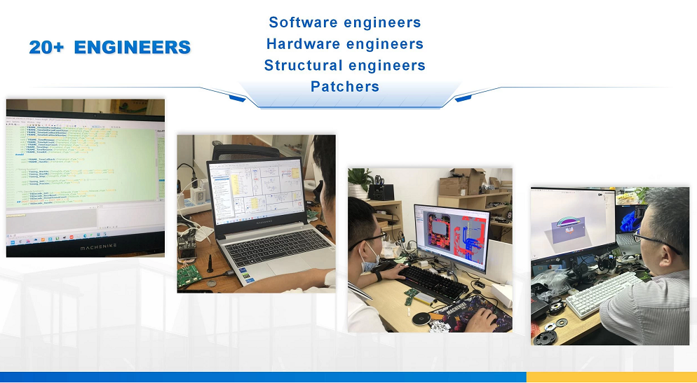 Unser Unternehmen verfügt über ein professionelles und anspruchsvolles Designteam, bestehend aus 6 professionellen Elektronikingenieuren, 6 qualifizierten Softwareingenieuren, 4 erfahrenen Maschinenbauingenieuren und 4 erfahrenen Patch-Ingenieuren. Wir können Ihnen einen umfassenden OEM- und ODM-Designservice bieten. In drei Tagen werden wir den Entwurfsentwurf erstellen. (设计团队)