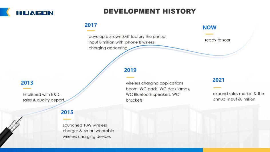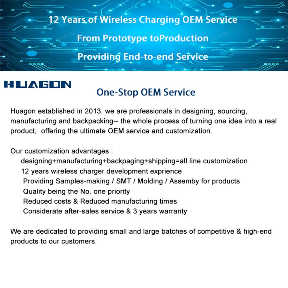 Huagon Technology beschäftigt sich seit 2013 mit der Individualisierung für unsere Kunden und hat mehr als 300 Arten der Massenproduktion von kabellosen Ladegeräten entwickelt, von kabellosen Telefonladegeräten über kabellose Autoladegeräte bis hin zu kabellosen 3-in-1-Ladegeräten, kabellosen Ladepads und kabellosen Ladegeräten Schreibtischleuchten bis hin zu multifunktionalen kabellosen Ladegeräten.